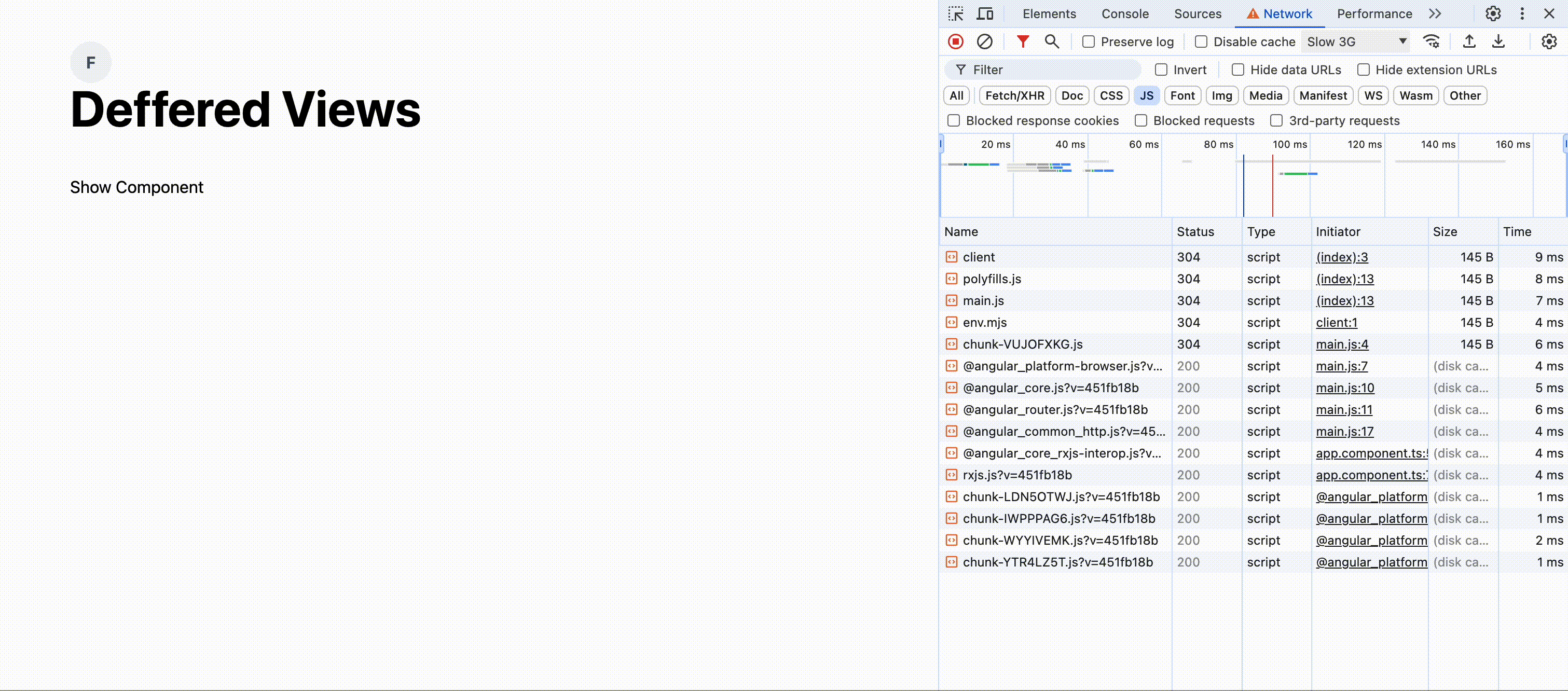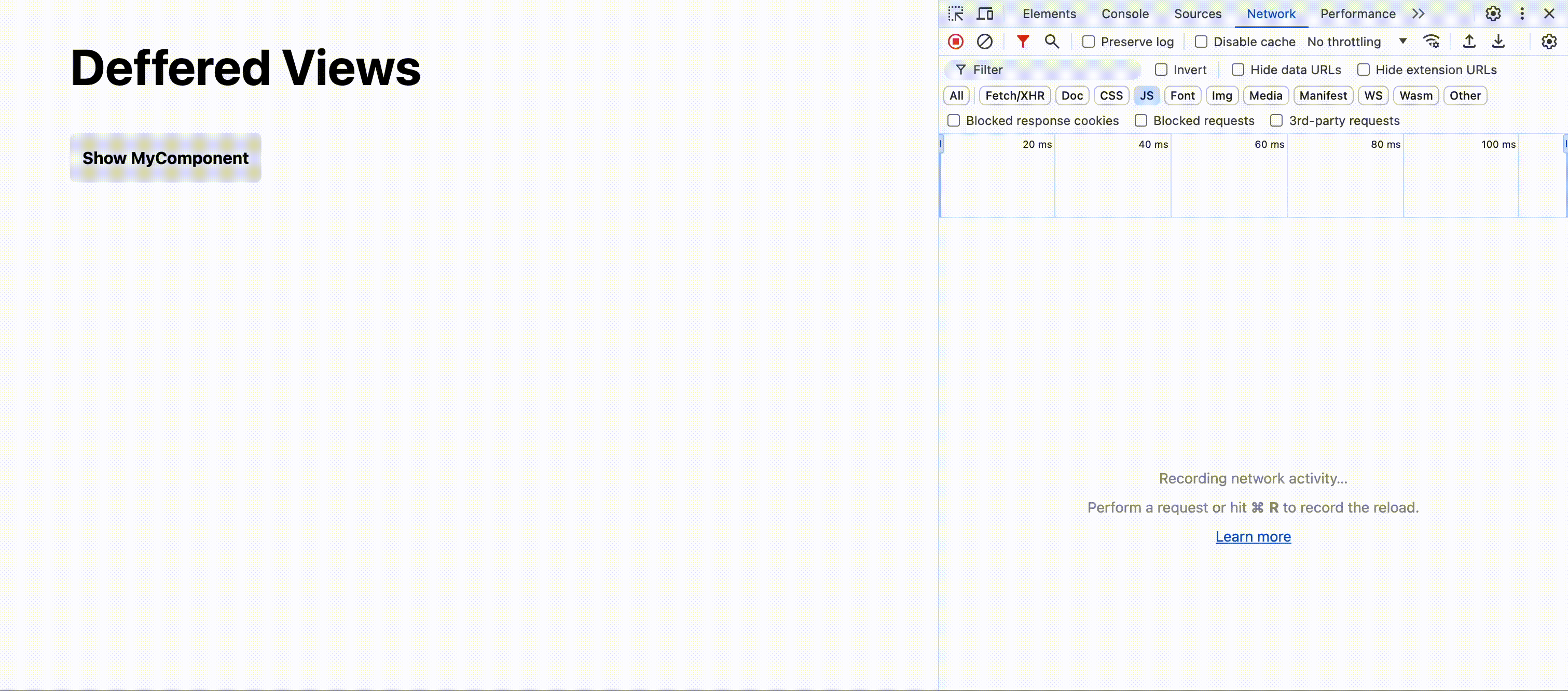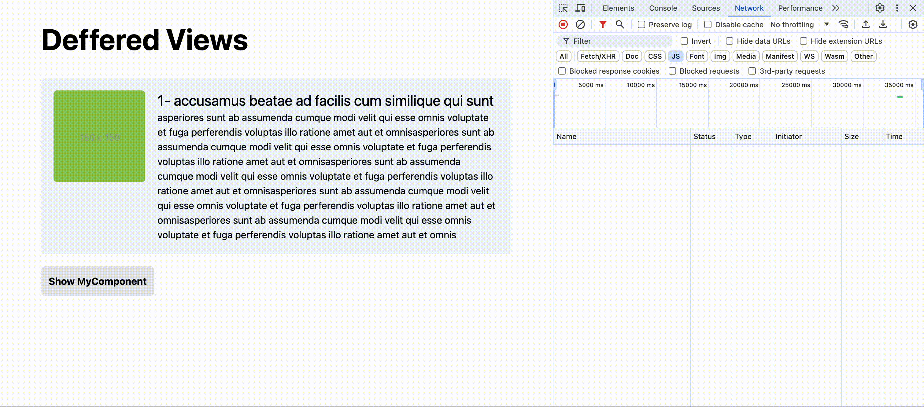 We will dive deeper into @defer API in next sections but what we’re doing in above code is that we’re deferring the download and rendering of MyComponent until showComponent is set to true as you can see it in the following